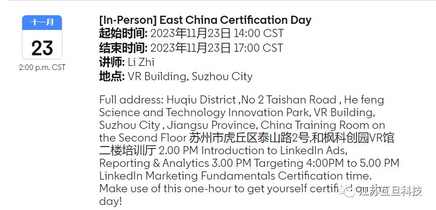 互旦科技是領英(中國)官方代理商之一,為了更好地提升自身領英營銷服務專業水平,進而賦能廣大外貿客戶做好出海營銷服務,2023年11月23日,領英(中國)連同互旦科技一起,舉辦了East China Certification Day的活動。來自領英(中國)的sky老師和李智老師從LinkedIn 廣告、報告和分析簡介、目標定位等板塊,為現場成員帶來了一場酣暢淋漓的講解,讓大家都收獲滿滿!